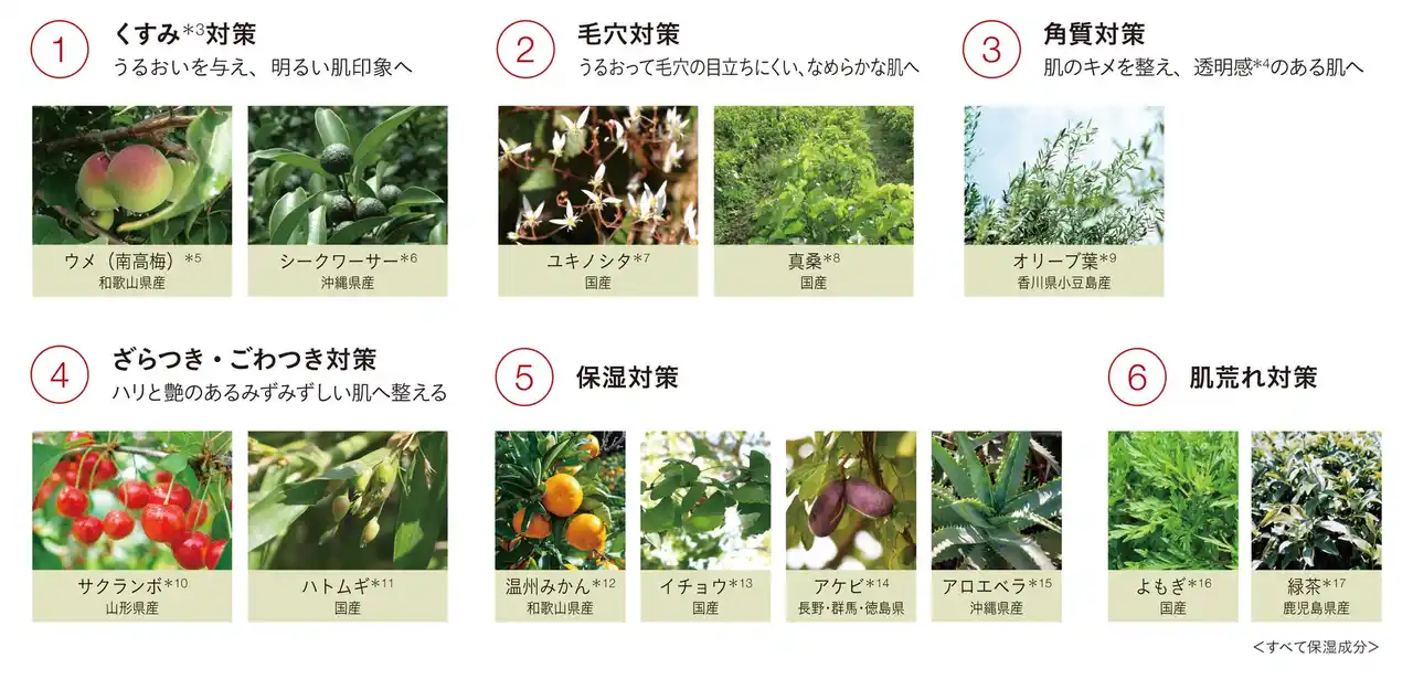 *1 ポリクオタニウム-51<保湿成分> リピジュアは日油株式会社の登録商標です *2 肌のキメを整えること *3 乾燥による *4 うるおいによる *5 ウメ果実エキス *6 シイクワシャー果皮エキス *7 ユキノシタエキス *8 マグワ根皮エキス *9 オリーブ葉エキス*10 セイヨウミザクラ果実エキス *11 ハトムギ種子エキス *12 ウンシュウミカン果皮エキス *13 イチョウ葉エキス *14 ミツバアケビ茎エキス *15 アロエベラ葉エキス *16 ヨモギ葉エキス *17 チャ葉エキス |