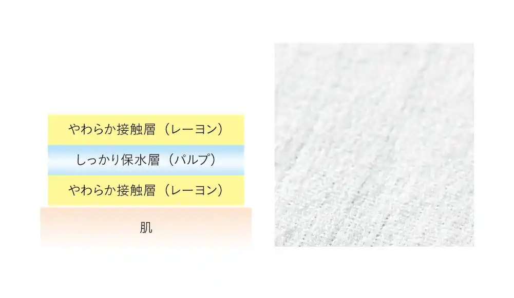 3層構造で、やわらかな肌あたり(接触層:レーヨン)としっかりとした水分保持(保水層:パルプ)を実現。 |