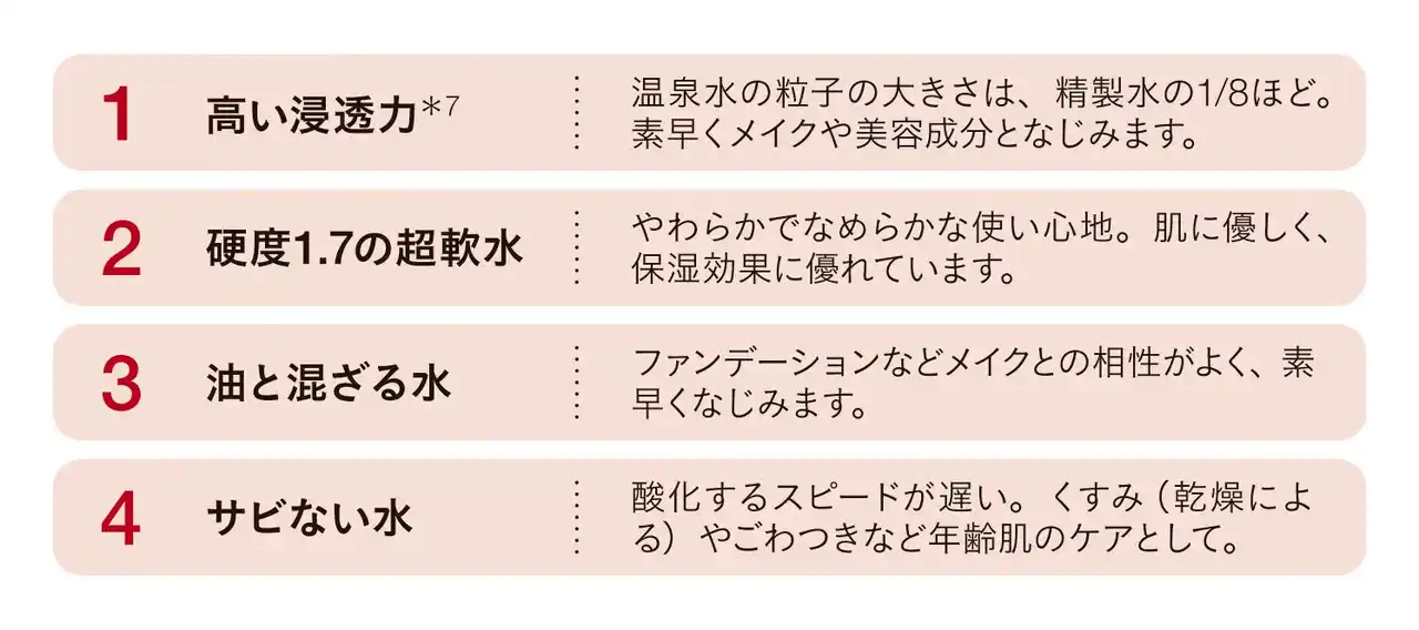配合水は、天然温泉水*3のみ*4。天然温泉水を89%配合 |
