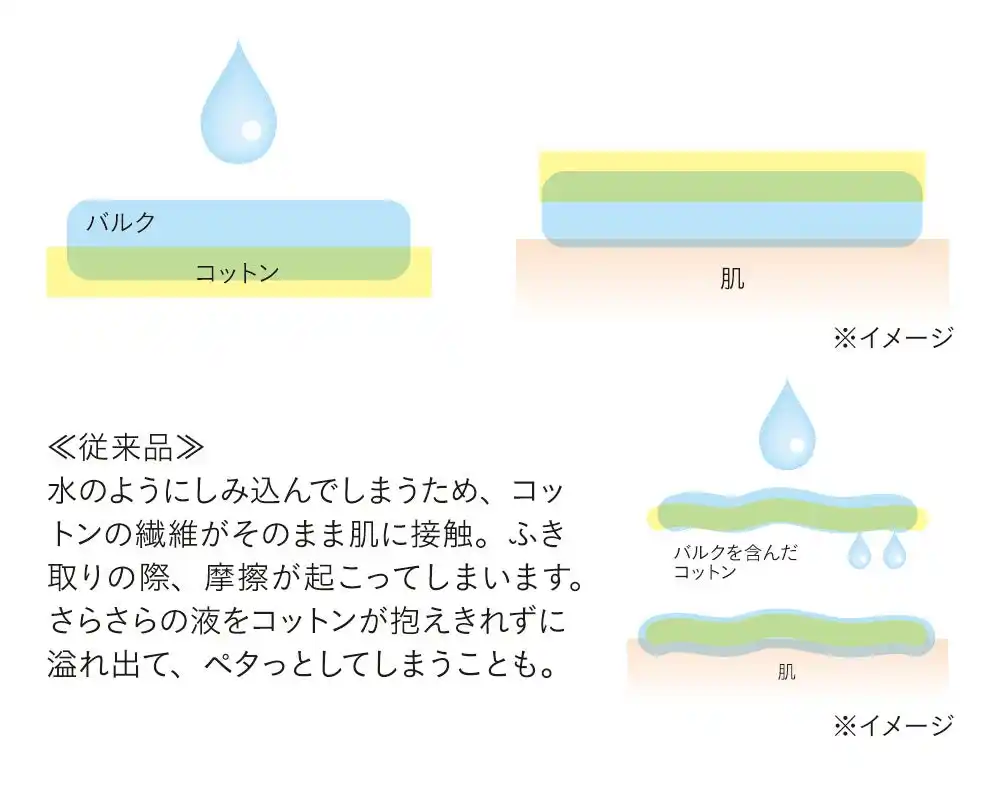 とろみのあるバルクが、コットンと肌の間にクッションを作ることで、コットンが直接肌にあたりません。また、とろみのある液をたっぷり含み厚みも増したコットンは、よりやわらかくなるため、肌当たりも優しく、摩擦から肌を守ります。 |