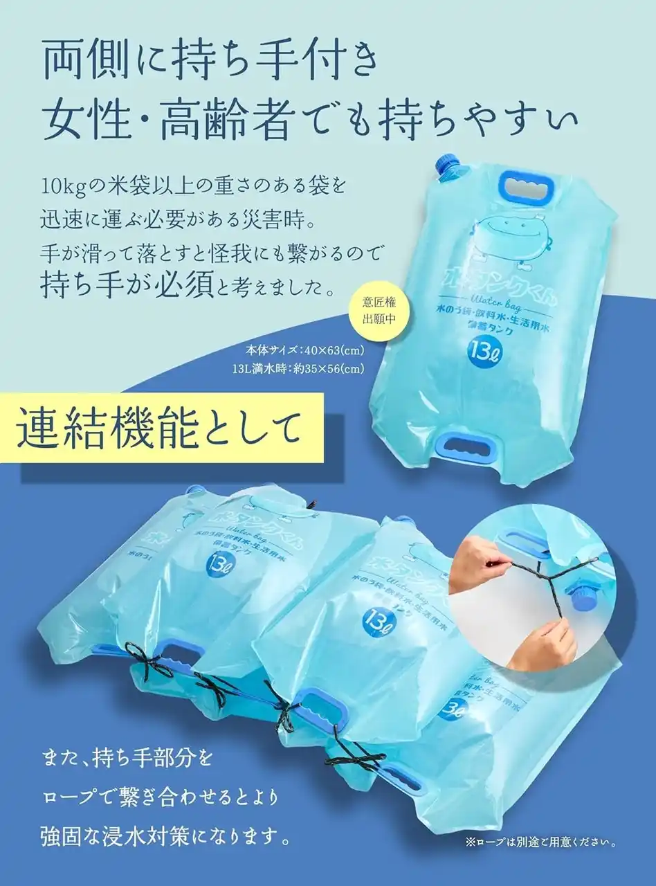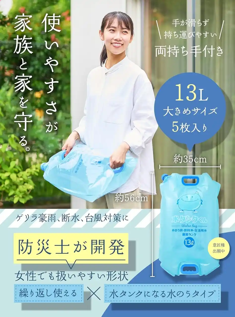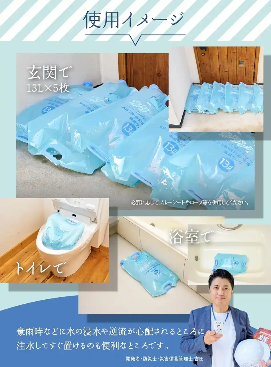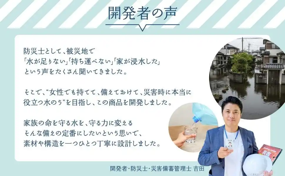 「水嚢(すいのう)は昔からある備えですが、“大きくて重い”“扱いにくい”という理由で普及していませんでした。そこで家庭で扱いやすい形に改良し、誰でも“すぐに置いて使える”ことにこだわりました。防災は特別なことではなく、暮らしの中に無理なく取り入れることが大切です。」 ──株式会社QUOKKA 吉田昌史 |