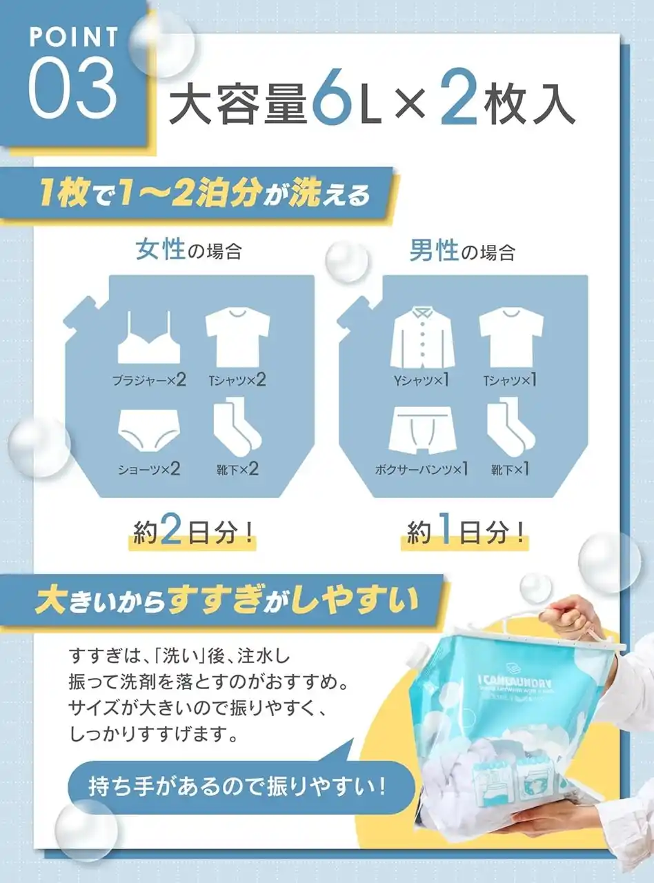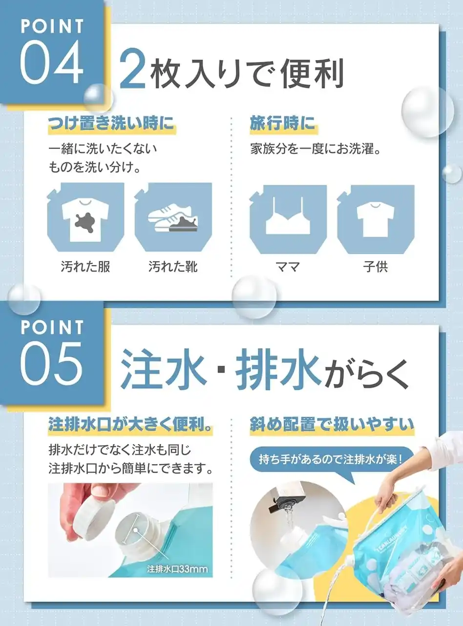 製品2.「つけおき・手洗い洗濯バッグ」─断水時でも清潔を守るコンパクト洗濯