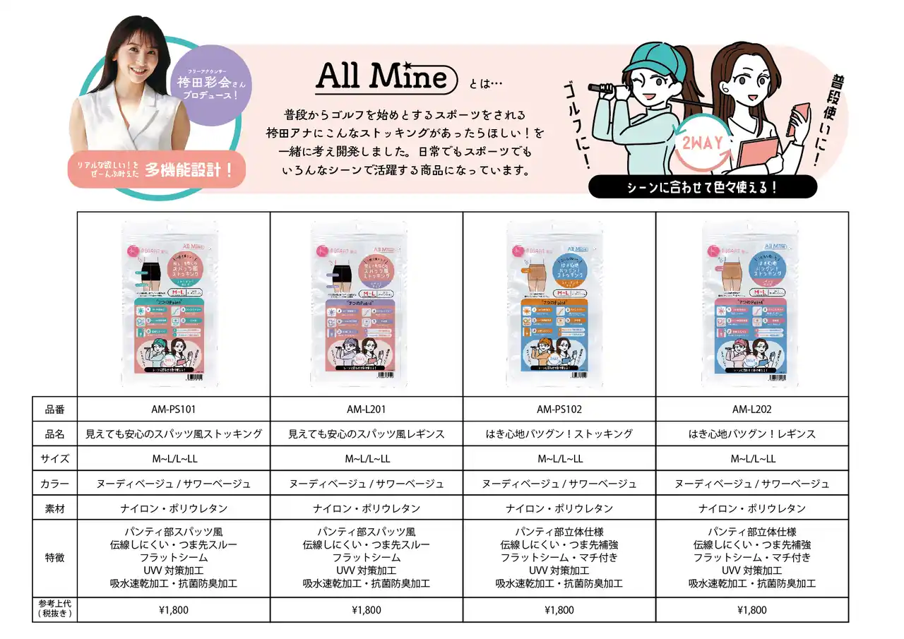 というリアルな声から生まれた、こだわりのアイテム「All Mine」が登場。 フリーアナウンサーとして活躍しながら、プライベートでも積極的に様々なことに挑戦する袴田彩会さんが本当に欲しかったストッキングが誕生しました。 |