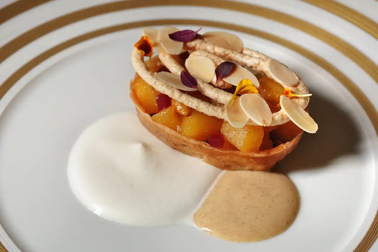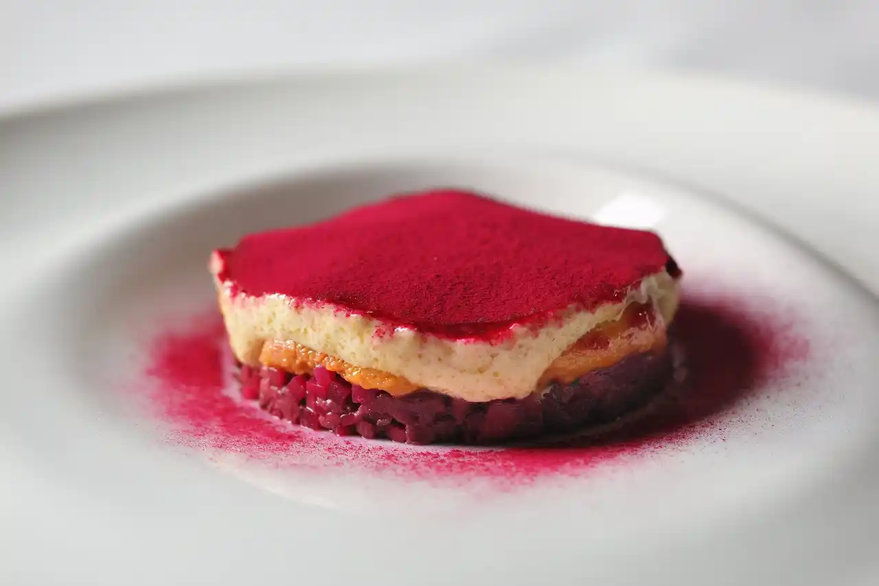 | シナモンが香る、2層仕立ての生地を土台に、甘酸っぱく煮詰めたりんごのコンポートやビーツ、香ばしいナッツやアーモンドメレンゲを重ねています。一般的なシュトゥルーデル(*5)は薄い生地で具材を巻き込んで焼き上げますが、今回は素材の風味や食感をより引き立てるため、それぞれの食材を重ねる構成に仕立てました。仕上げのソースは、まろやかな牛乳とコクのあるヘーゼルナッツの2種類。豊かな香りとやさしい甘さが、秋の余韻を締めくくります。 | |||||||||||||||