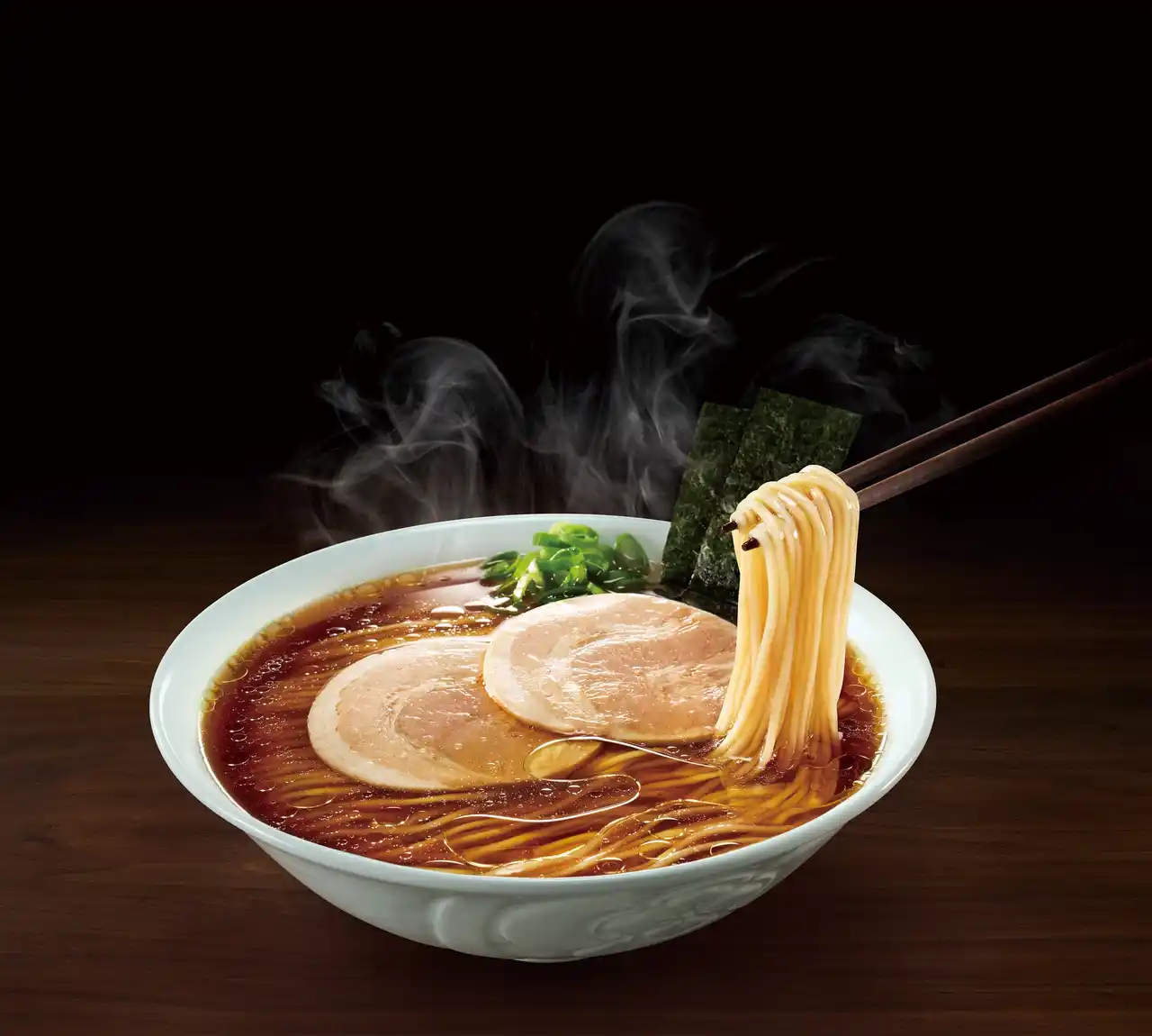<スープ>鶏・豚・魚介の素材の旨味・甘みを引き出し、厳選した醤油を合わせた芳醇醤油味です。 |