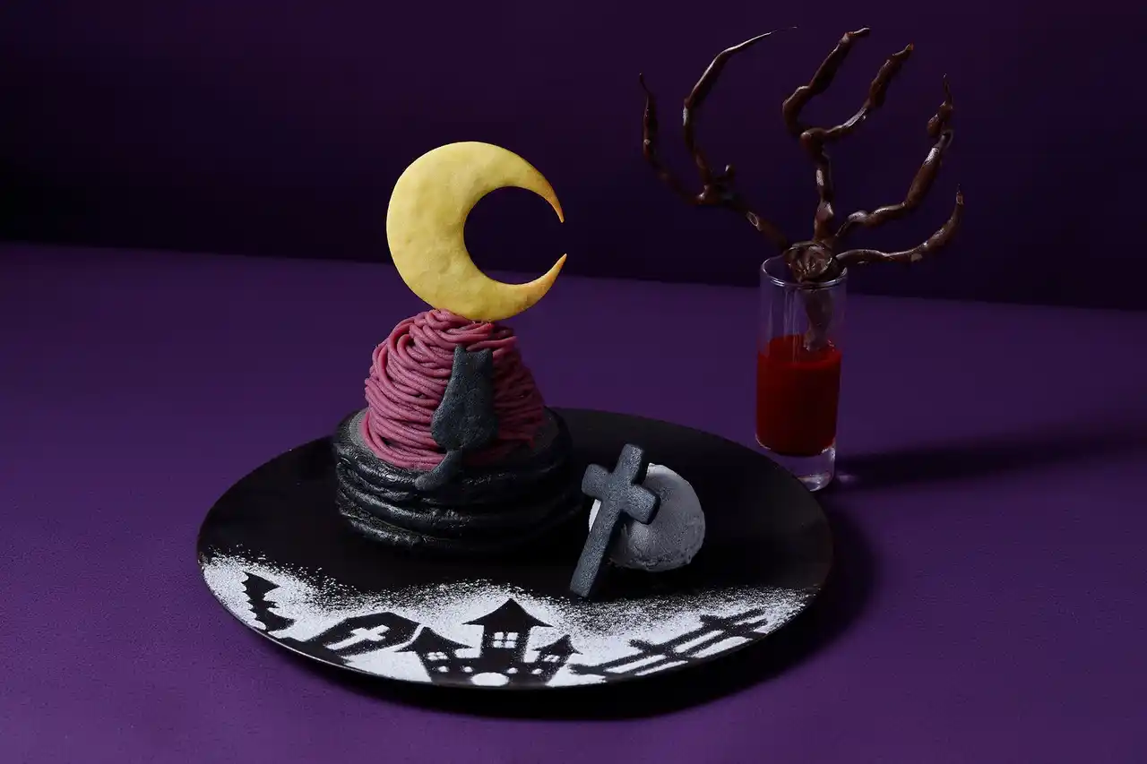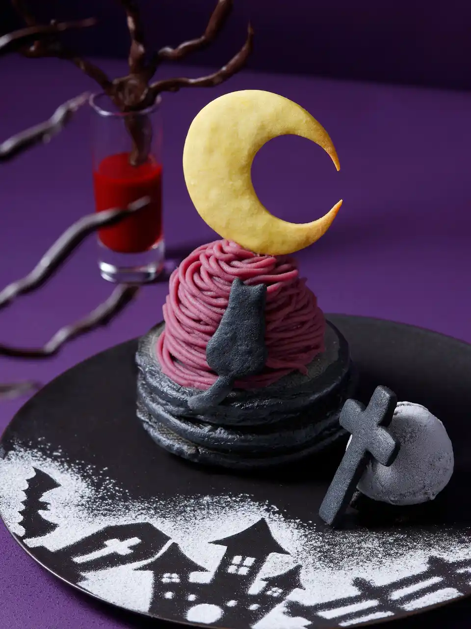 竹炭で真っ黒に染まったパンケーキを3枚重ね、口当たり軽やかなクレームフェッテを中にしのばせた濃厚な紫芋のモンブランクリームをたっぷりとしぼりました。トップには三日月、シャドウキャットが佇み、ミステリアスな夜を演出。さらにお墓のような黒ごまのアイスや、プレートアート、サイドの真っ赤なベリーソースから生える怪しげな枯れ木のチョコレート細工がハロウィン気分を盛り上げます。 |
