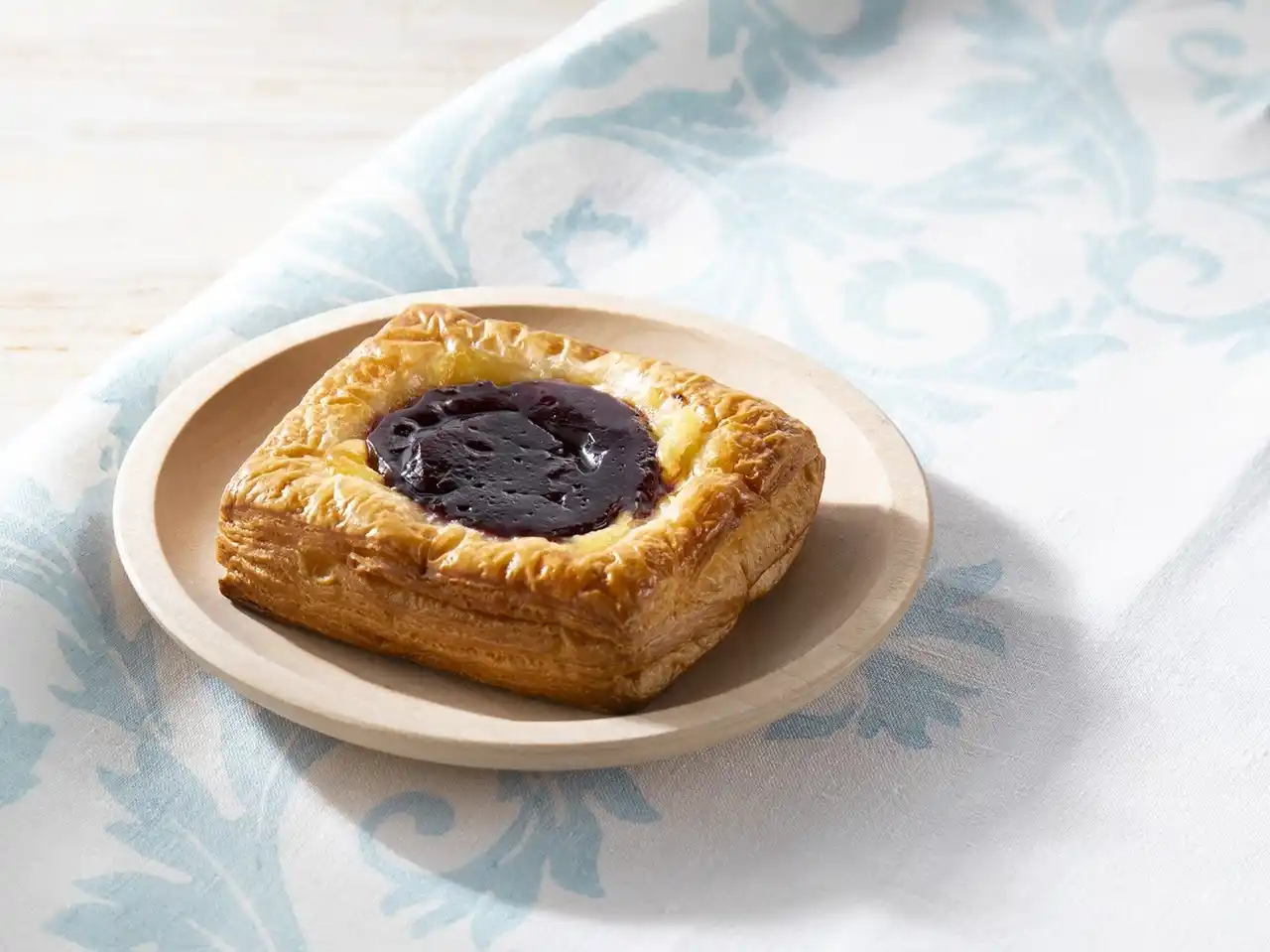胆振地方特産品「アロニア(※1)」を贅沢に使ったジャムのデニッシュが新登場。甘味と酸味が特徴のアロニアを、食べやすい風味豊かなジャムにし、サクサクのデニッシュ生地と組み合わせました。 |