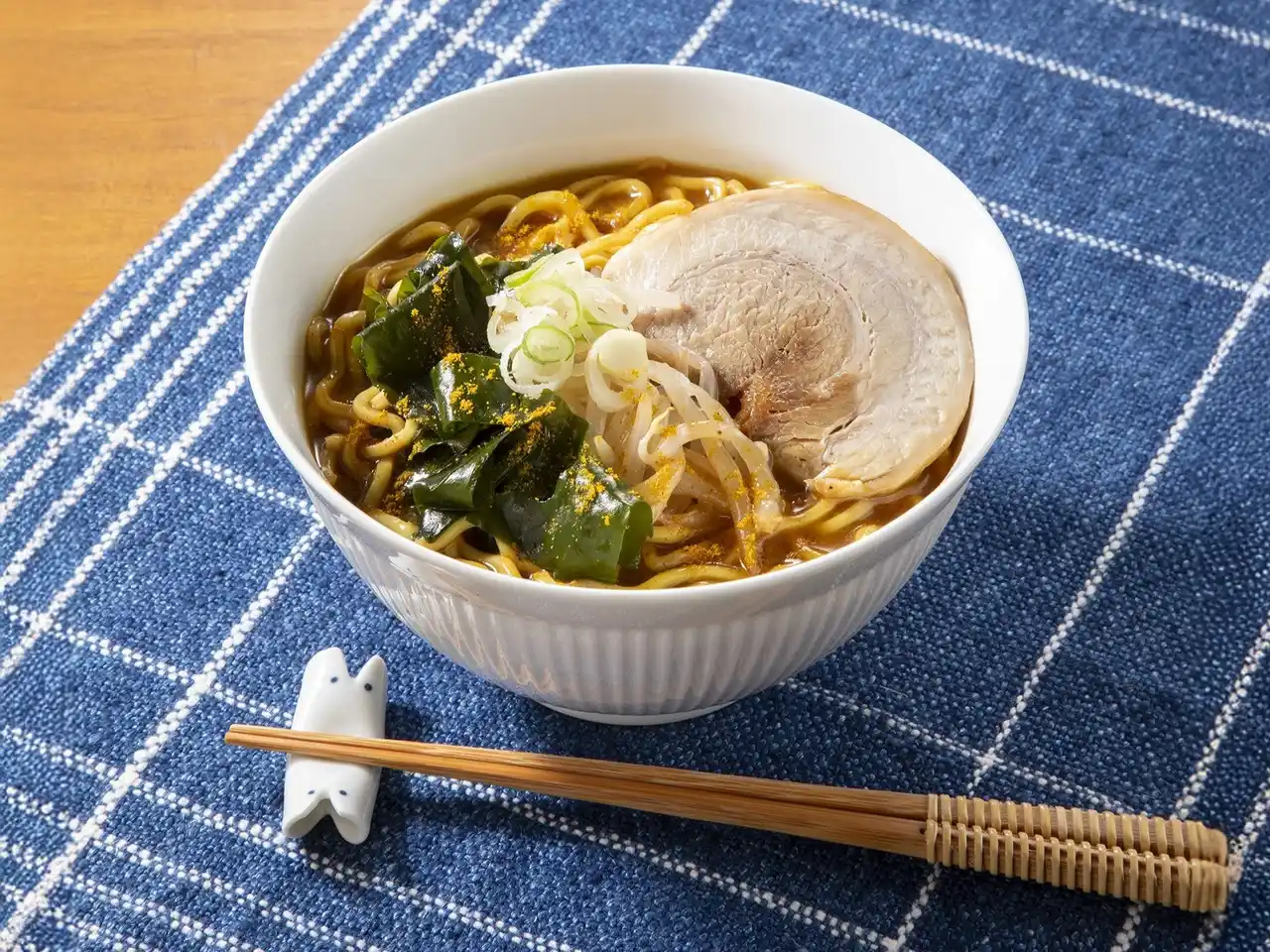 炒め玉ねぎでとろみとコクを追求した濃厚なカレースープがよく絡むように、中太ちぢれ麺を使用しています。麺の上には定番のチャーシュー、わかめ、ねぎをトッピング。ご当地グルメ「カレーラーメン」をセブン‐イレブンでもお楽しみください。 |