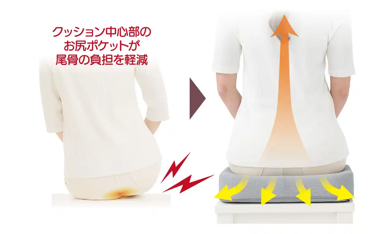 | 体圧分散性に優れた低反発ウレタンが体重をしっかり受け止め、中央のお尻ポケットに向かってゆっくりと沈み込むため、長時間座っても楽ちんです。 | |||||||||||||||