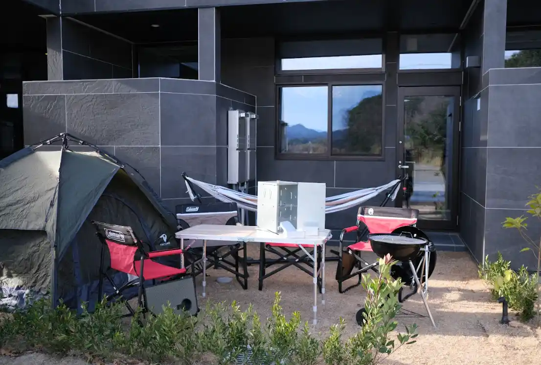 また各部屋にある庭では、グランピング気分を満喫できます。テントや焚き火台を囲んで、BBQやマシュマロを焼いたりとお子様も全力で楽しむことができますます。 |