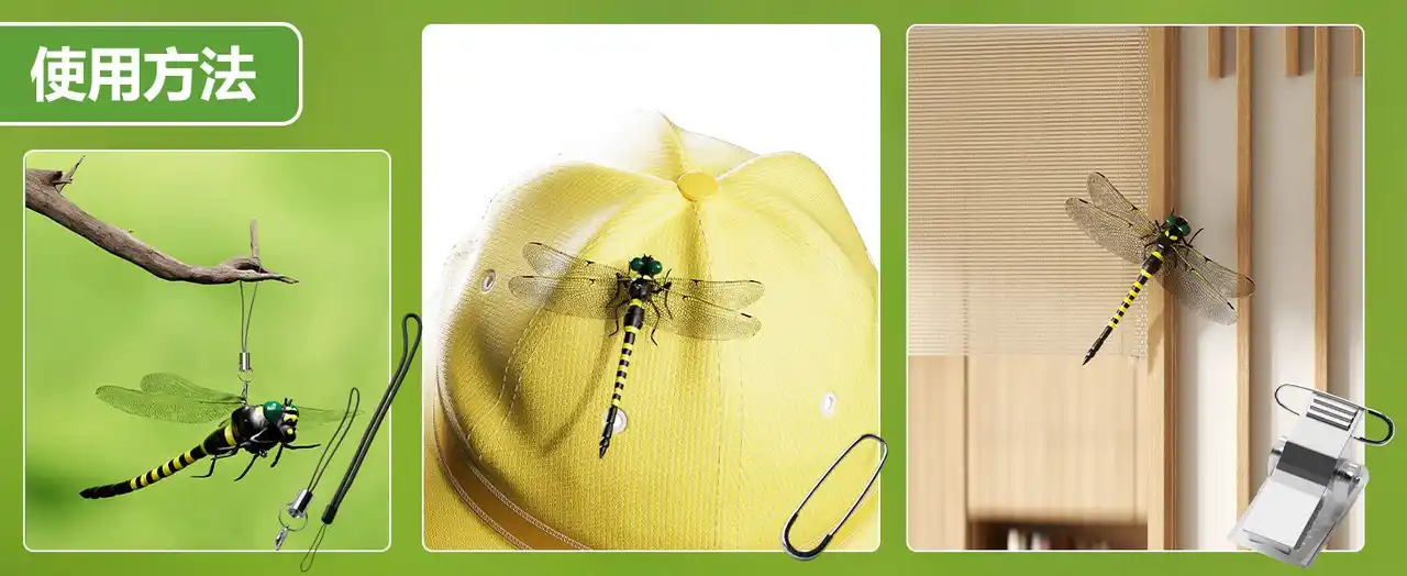 「虫除けトンボ君」は、ミツバチ、蚊、スズメバチ、蝶、蛾、アブ、ハエなど様々な小型昆虫に対し、トンボが持つ天敵効果を再現したアイテムです。外観やサイズ、色彩を本物のマウンテンゴーストトンボに近づけたリアルな仕上がりで、自然な警告・忌避効果を発揮します。 |