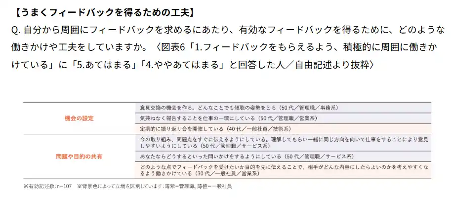 一方、フィードバックを求めている人は、「定期的に振り返り会を設ける」など機会の設定や、「目的を明示してフィードバックを求める」といった問題や目的の共有などの工夫を行っているようである。 |