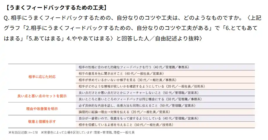 ⇒このような経験が、以後のフィードバックの「提供」をためらわせることも理解できるが、一方で、それらの経験を通じて学び「相手に応じた対応」「良い点と悪い点のセット提示」「理由や改善策を明示」「敬意と信頼を示す」など、具体的な工夫をしている人も多い(管理職 48.0%、一般社員35.9%が該当)。状況や相手により正解のないフィードバックだが、知見や経験をもつことで積極的な「提供」が可能になると考えられる。 |