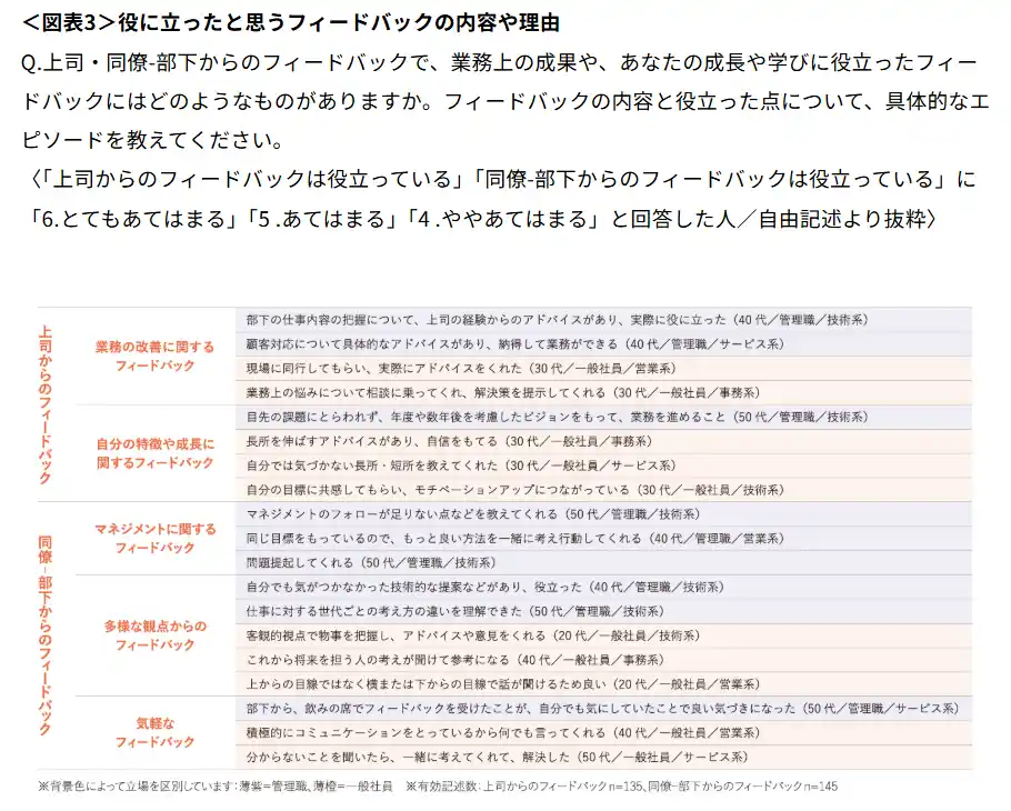 業務上の成果や自身の成長・学びに役立ったフィードバックの内容について自由記述を求めたところ、「上司からのフィードバック」については、特に「業務の改善に関するフィードバック」と「自分の特徴や成長に関するフィードバック」が見られた。前者は、実践的かつ即時的なフィードバックが役立ったという記述が多かった。後者では、自分の考えを尊重されたり、自信やモチベーションを高めたりする内容が役立ったとするケースが多く見られ、記述数としては業務改善に関するフィードバックの約半数程度であった。 |