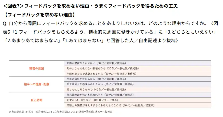 フィードバックを積極的に求めない理由(図表7)としては、「職場の文化がそうでないから」などの職場の要因、「相手に負担がかかるから」などの遠慮・配慮、「課題が増えることを避けたい」といった自己防衛が挙げられた。 |