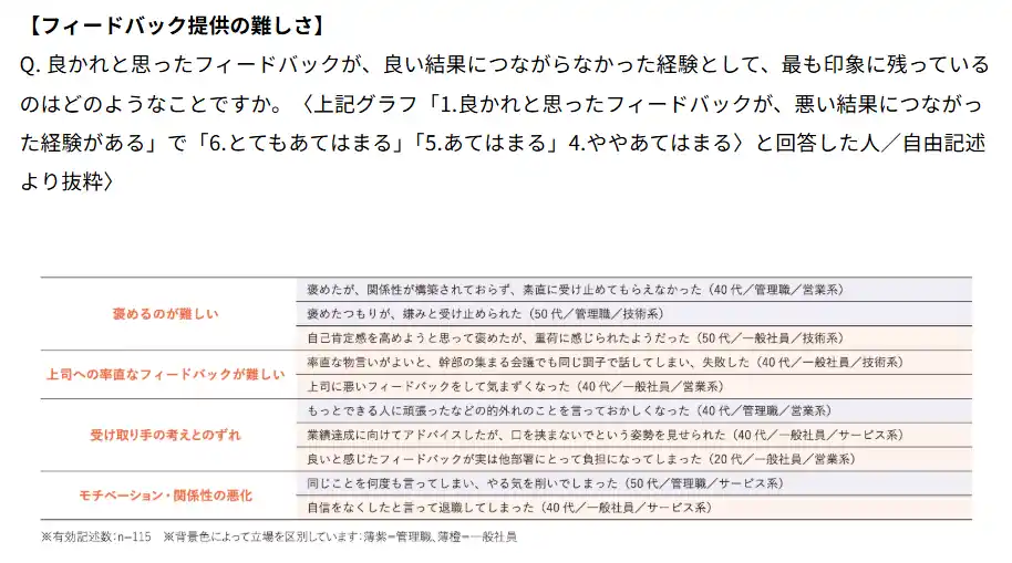 「良かれと思ったフィードバックが、悪い結果につながった経験があるか」という問いに対して、管理職の41.1%、一般社員の32.6%が該当すると回答した(図表9)。自由記述では、「褒めたのに素直に受け止めてもらえなかった」「率直に話しすぎて失敗した」「意図が伝わらず関係が悪化した」「結果的に退職につながった」など、印象に残る出来事が多く寄せられた。 |