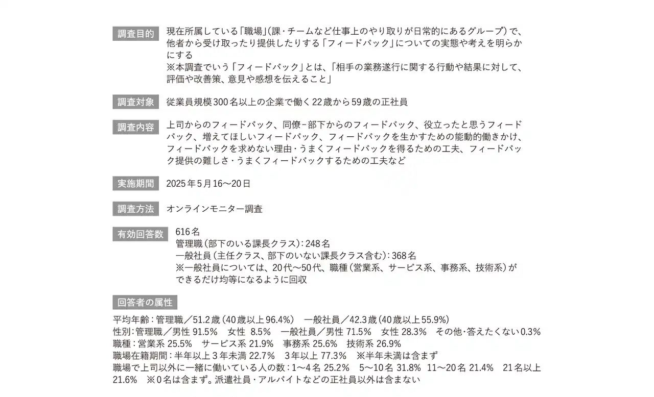 以下、当社)は、従業員規模300名以上の企業に勤める22歳から59歳の正社員を対象に、「職場におけるフィードバック実態調査」を実施いたしました。職場における「フィードバック」は、個人やチームの成長、信頼関係の構築を支える重要な要素です。良いフィードバックを受け取るためには、受け手の姿勢や働きかけも求められ、逆に提供する際には、相手への配慮やタイミングといった工夫が必要となります。本調査ではフィードバックの「受け取る」「生かす」「提供する」の3側面に注目し、それぞれの実践度や成長実感との関連を多角的に検証しました。 |