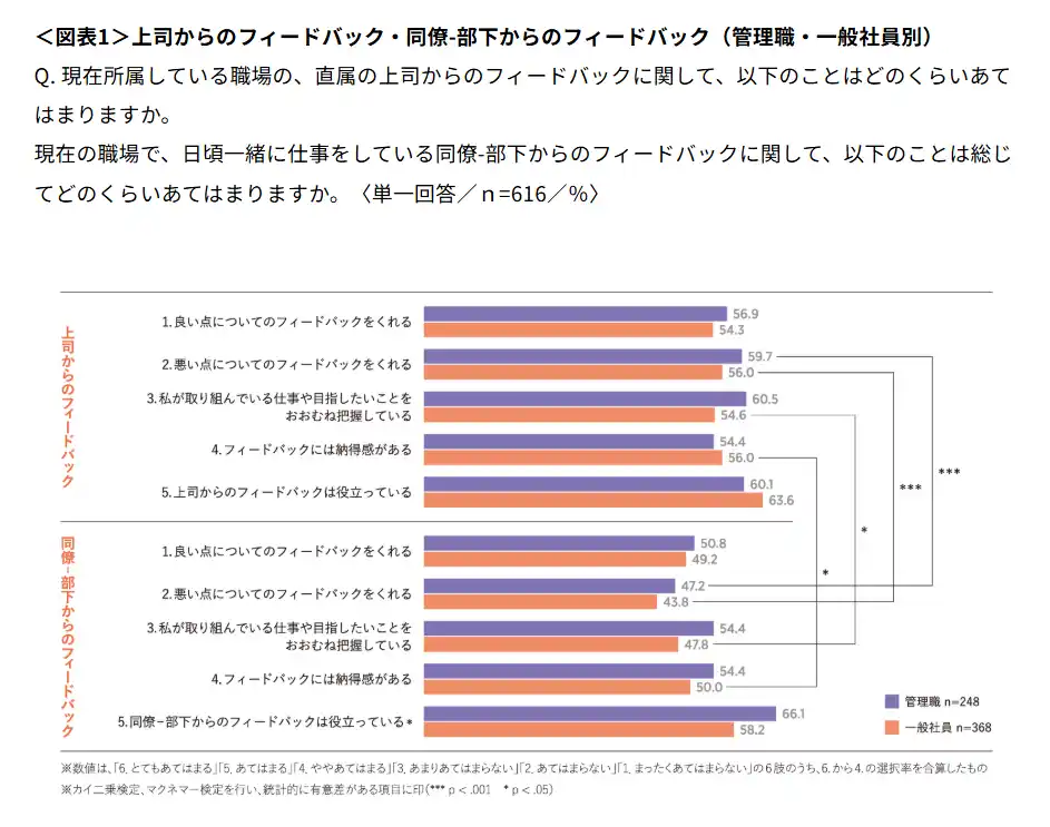上司が「良い点についてのフィードバックをくれる」とした回答は、管理職が56.9%、一般社員が54.3%、同僚-部下が「良い点についてのフィードバックをくれる」とした回答は、管理職が50.8%、一般社員が49.2%で、「上司から」と「同僚-部下から」の間に有意差はなかった。 |