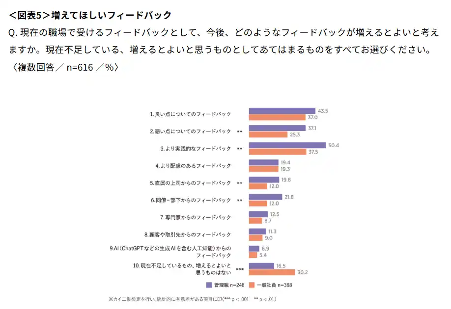 今後増えてほしいフィードバックとしては「より実践的なフィードバック」が最多。特に管理職は5割を超える結果に(図表5)