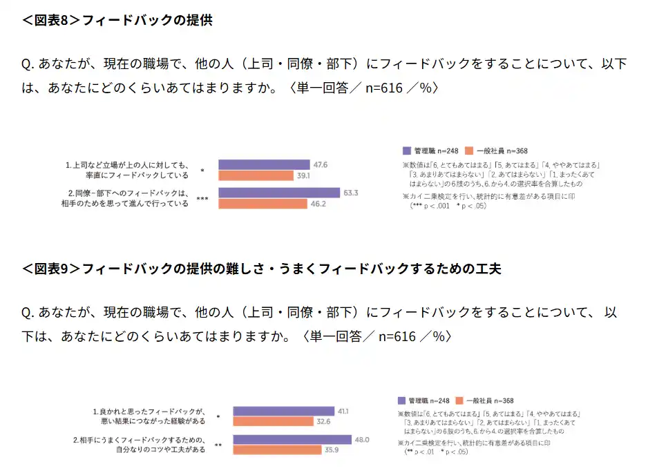 フィードバックを「提供する」ことについて、上司など目上の立場の人へのフィードバック、同僚-部下へのフィードバックのいずれにおいても、 管理職の方が一般社員よりも有意に高い数値を示した(管理職の方が目上の人・同僚-部下に対してフィードバックを提供している)(図表8)。 |