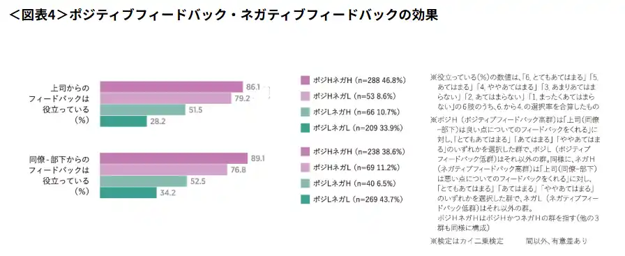 上司、または同僚-部下が「良い点についてのフィードバックをくれる」「悪い点についてのフィードバックをくれる」かについて、それぞれの肯定的回答群をポジH・ネガH、否定的回答群をポジL・ネガLとして、4群(ポジHネガH /ポジHネガL/ポジLネガH /ポジLネガL)に分類し、それぞれの「フィードバックは役立っている」とする回答割合を比べた。 |