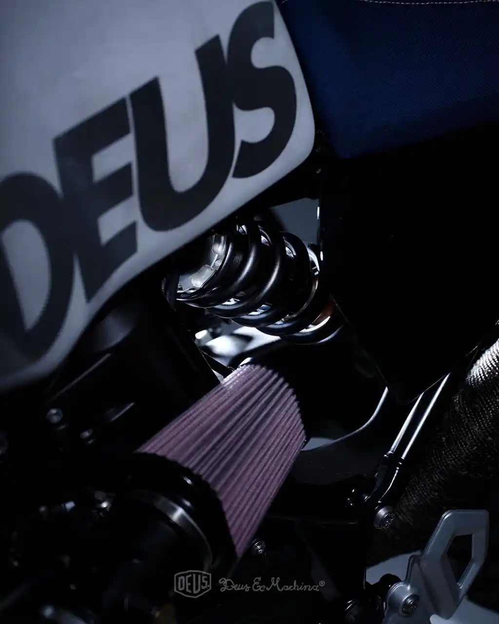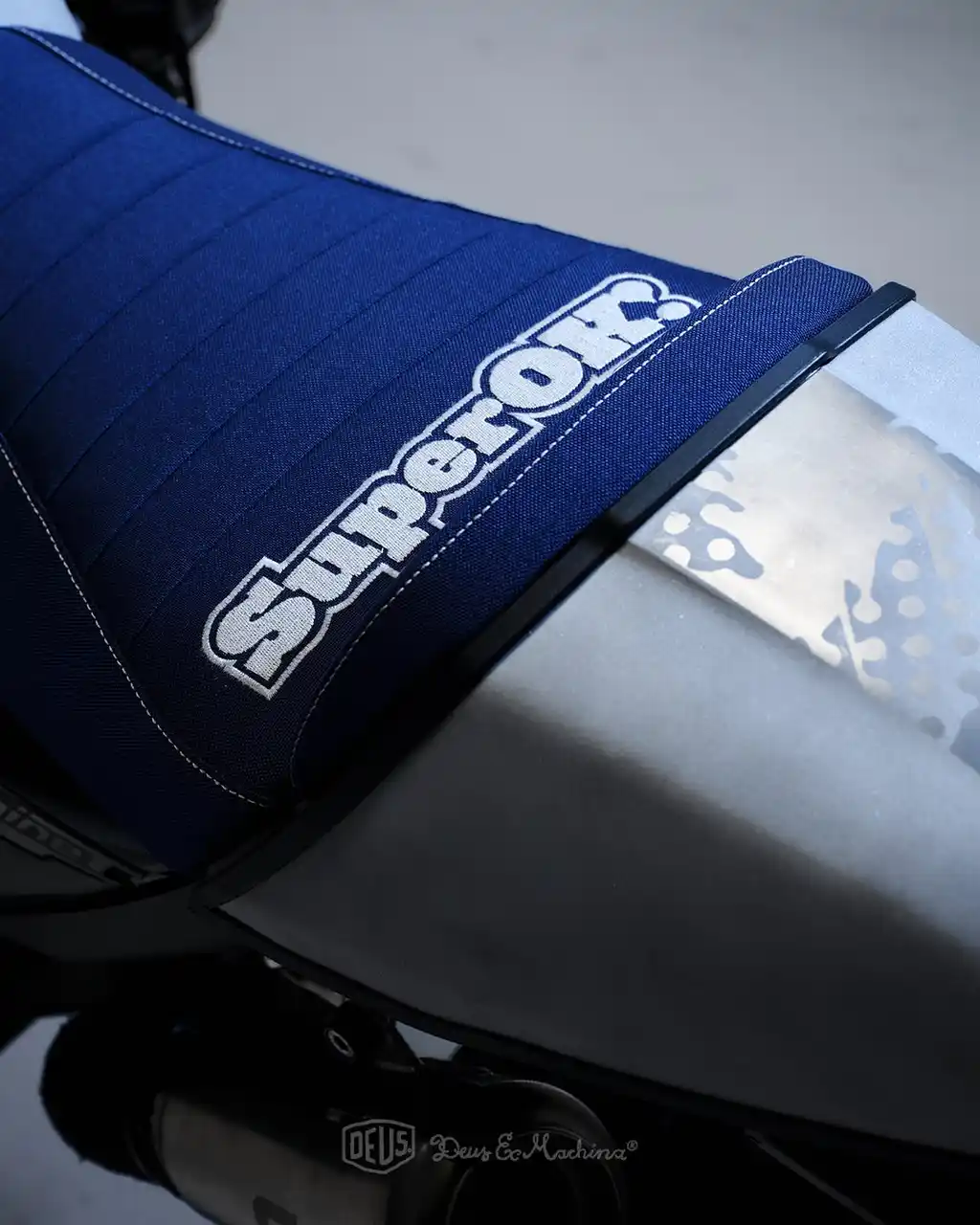 露出したDNAフィルター、ライディングジャケットを再利用したシート、サンドブラスト加工による無骨な質感、そしてブルーに輝くデウスバッジ。 最小限のカスタムでありながら、スタンダードなロードスターを荒野へ踏み出すアドベンチャーマシンへと進化させた一台です。 |
