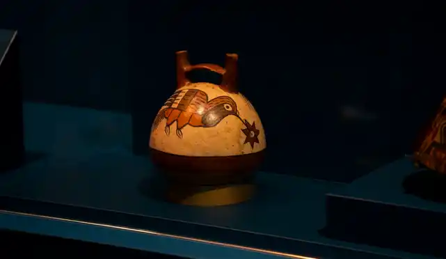 ナスカといえば世界遺産「ナスカの地上絵」が広く知られていますが、本展ではその背後に広がる自然観や信仰に光を当てます。ハチドリ、クモ、トカゲ、花などを描いた土器や壺、アンタラ(土器製の儀式用パンフルート)、神話的存在を象徴する造形はいずれも、水の循環や生命の再生を象徴するモチーフとして位置づけられ、単なる自然描写を超えて儀礼の中で神聖な力を呼び起こす存在でした。考古学的資料と現代的な演出を組み合わせることで、ナスカ文化の世界観を伝えます。 |