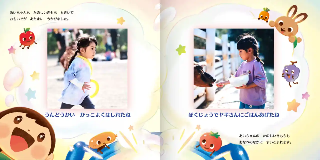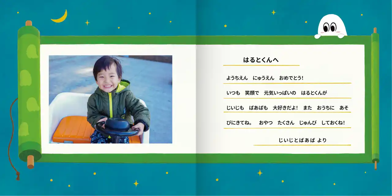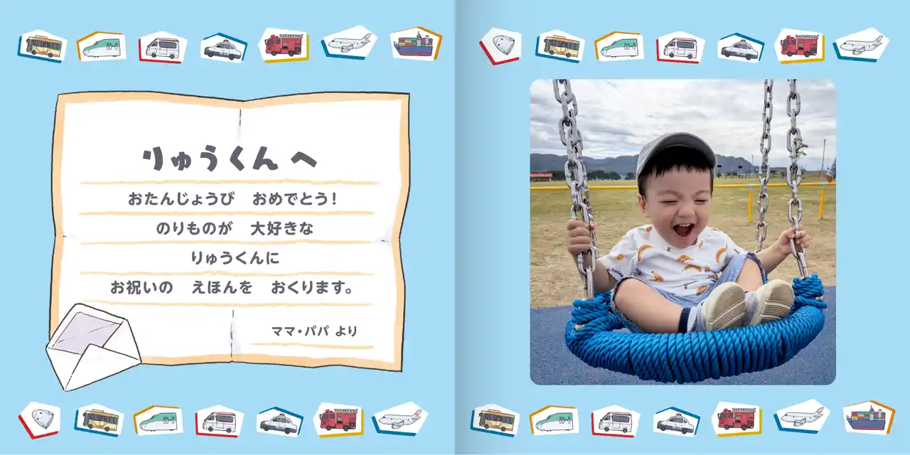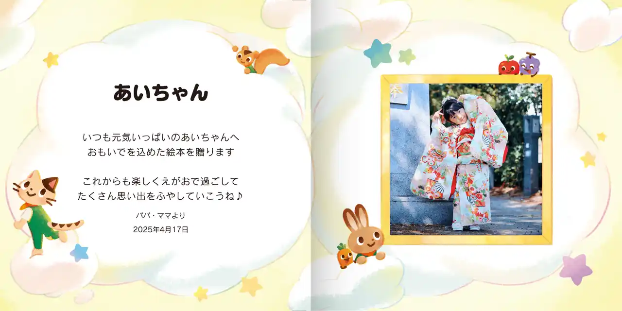 | 絵本の冒頭には、お写真とメッセージを入れられるページもあります。 | ||||||||||||||||||||