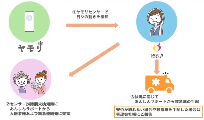 | 看護師などの有資格者が24時間365日常駐するコールセンターを軸に、安否確認・見守り事業を手掛ける株式会社あんしんサポート(本社:福岡県福岡市、代表取締役:古賀 功一)は、「不動産の民主化」をミッションに、テクノロジーを活用した不動産オーナー自立支援サービスやIoTを活用した見守りサービスなどを展開する株式会社ヤモリ(本社:東京都渋谷区、代表取締役:藤澤 正太郎)と業務提携し、同社が提供するLPWA方式「Sigfox通信」に対応したモーションセンサー(人感センサー)を活用した見守りサービスを本格導入いたしました。 | |||||||