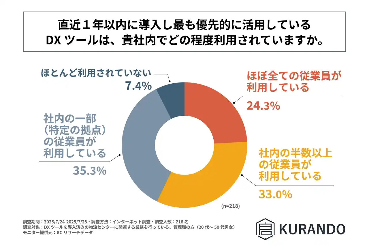 株式会社KURANDO(本社:東京都品川区、代表取締役:岡澤 一弘)は、DXツールを導入済みの物流センターに関連する業務を行っている管理職の方を対象に「物流センターにおけるDXツールの導入効果と課題」に関する調査を実施しました。この調査から、DXツールを導入済みの物流センターにおけるDXツールの導入状況や効果、課題などが明らかになりました。