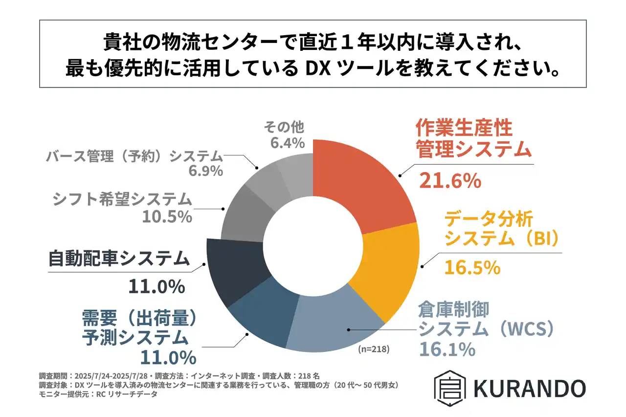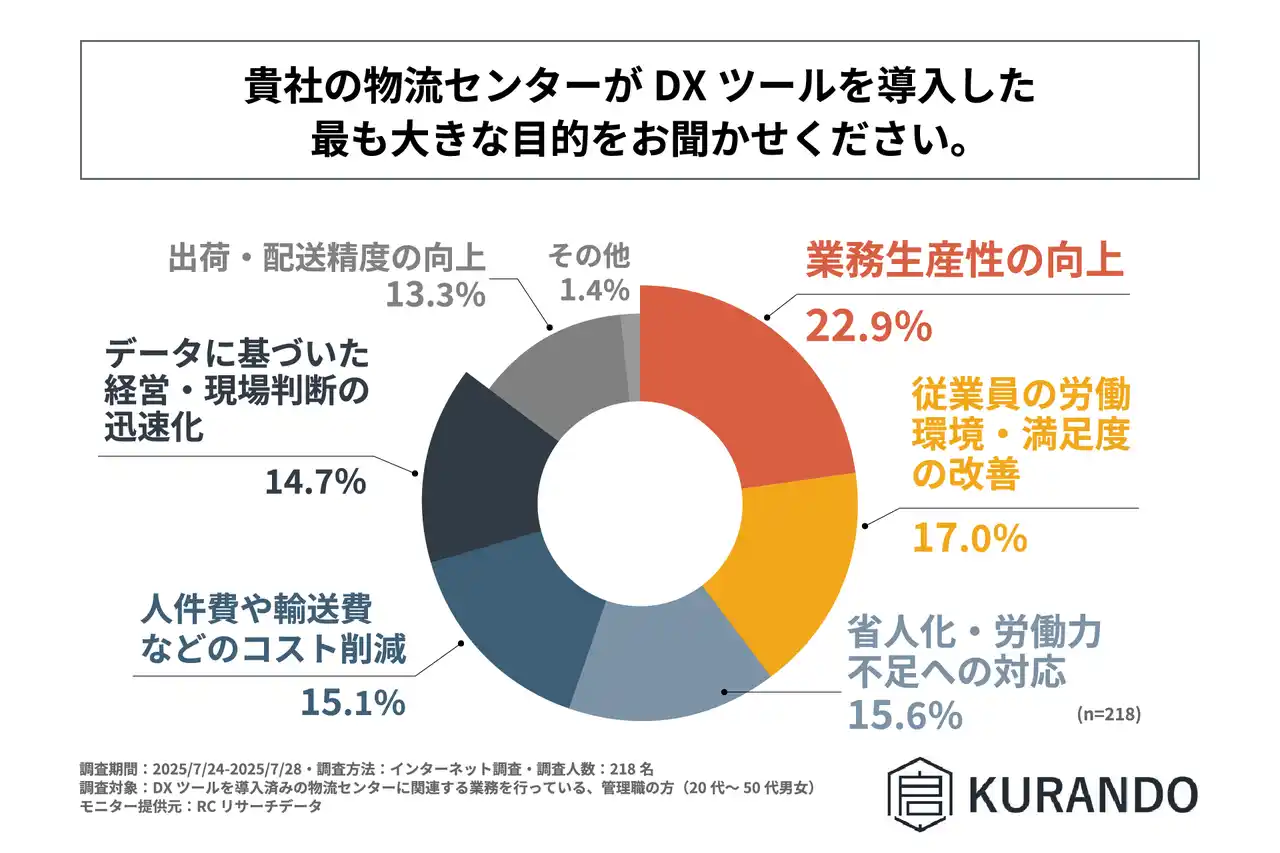 株式会社KURANDO(本社:東京都品川区、代表取締役:岡澤 一弘)は、DXツールを導入済みの物流センターに関連する業務を行っている管理職の方を対象に「物流センターにおけるDXツールの導入効果と課題」に関する調査を実施しました。この調査から、DXツールを導入済みの物流センターにおけるDXツールの導入状況や効果、課題などが明らかになりました。 |