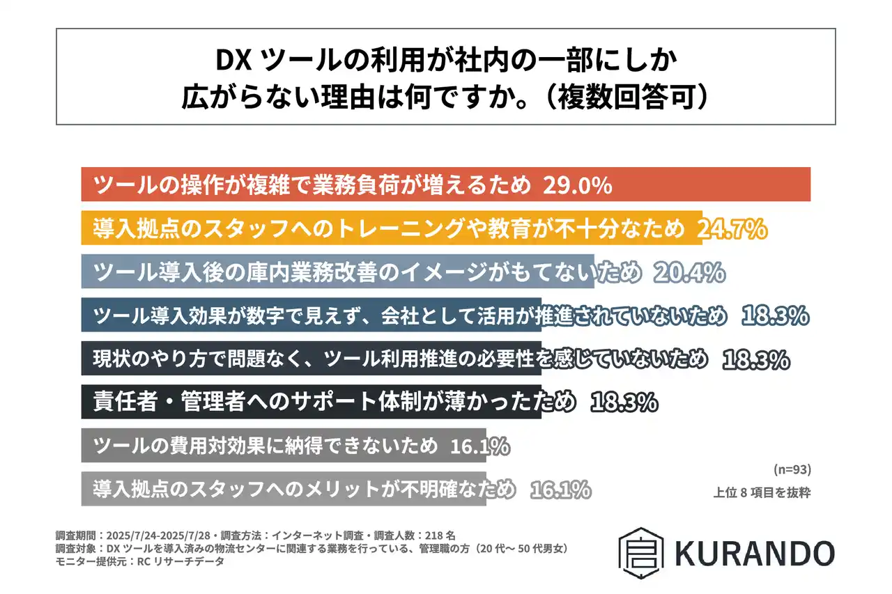 DXツールが社内の一部でしか利用されていない物流センターに関わる管理職の方が考える、DXツールの利用が社内の一部にしか広がらない理由、1位は「ツールの操作が複雑で業務負荷が増えるため」 |