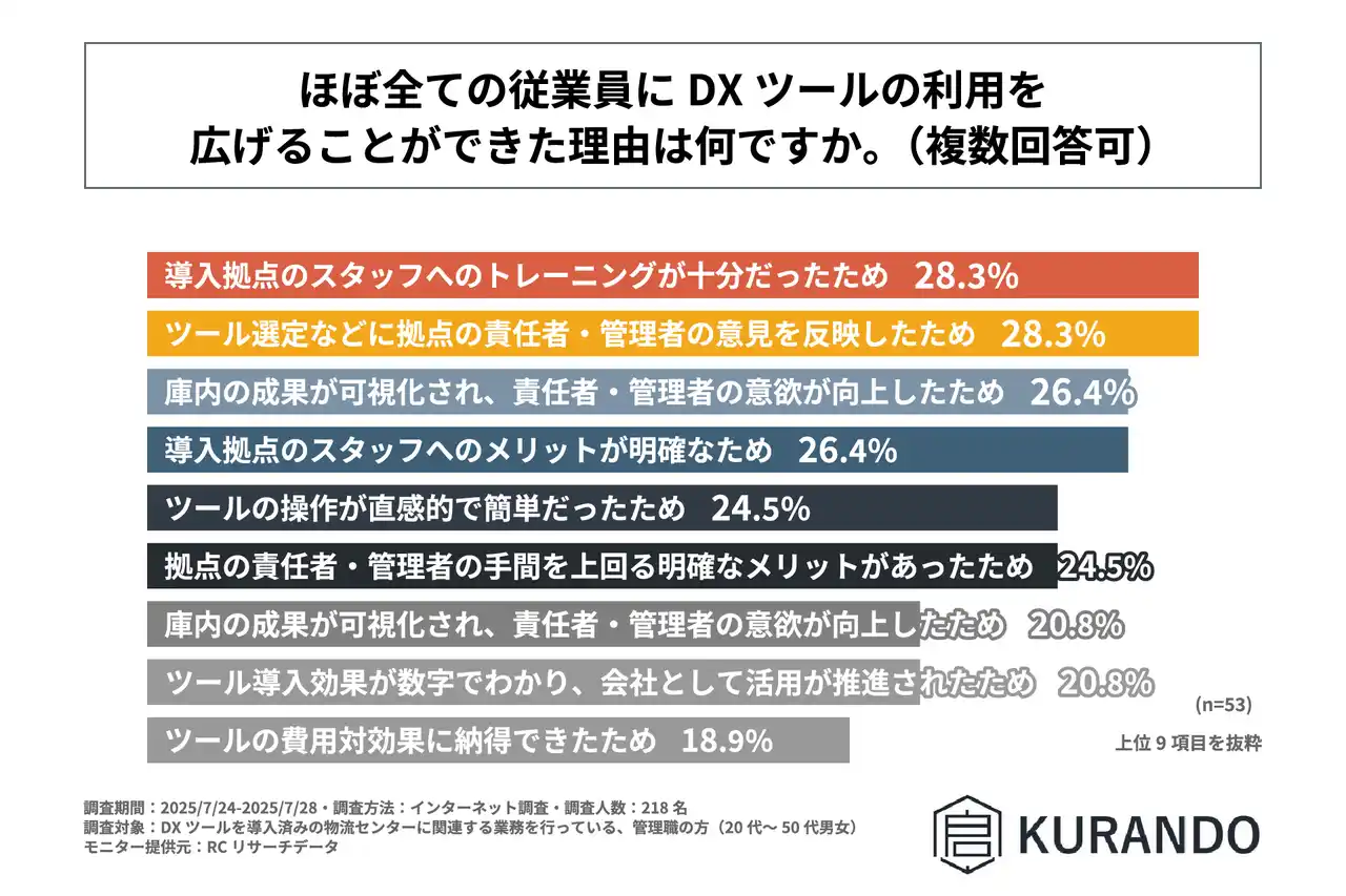 調査の最後、DXツールをほぼ全ての従業員が利用していると回答した人を対象に「ほぼ全ての従業員にDXツールの利用を広げることができた理由」を尋ねる設問への回答では、1位が同率で「導入拠点のスタッフへのトレーニングが十分だったため」、「ツール選定などに拠点の責任者・管理者の意見を反映したため」で28.3%、3位も同率で「庫内の成果が可視化され、責任者・管理者の意欲が向上したため」、「導入拠点のスタッフへのメリットが明確なため」で26.4%という結果になりました。