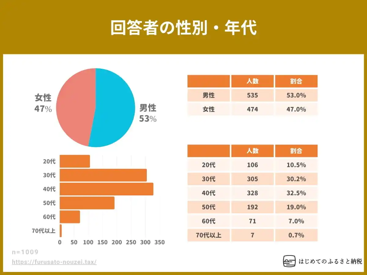| 当該アンケート調査のほか、はじめてのふるさと納税では、世の中の「ふるさと納税事情」について、全国の20代~70代以上の男女(計1,009名)を対象に行った、「ふるさと納税に関するアンケート調査」をもとに、2025年度の調査データを公開しています。 | |||||||||||