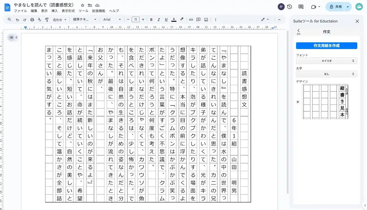 | Google Workspace for Education の標準機能にはない、日本の学習環境に必須の縦書き・ルビ機能を独自に開発。さらに、今後リリース予定の Google ドキュメント(TM) で作文用紙を表示できる機能は、児童生徒の作文指導や作品発表を強力にサポートします。また、書字に困難をかかえる児童生徒への支援ツールとしても利用できます。 | |||||||