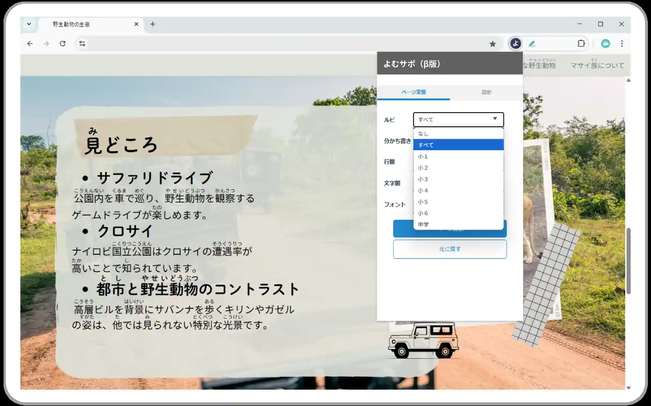 | 読字障害(ディスレクシア)など、文字を読むことに困難を抱える子どもたちのために、ウェブサイトの文字間、行間の調整や分かち書き表示を開発しました。 | |||||||