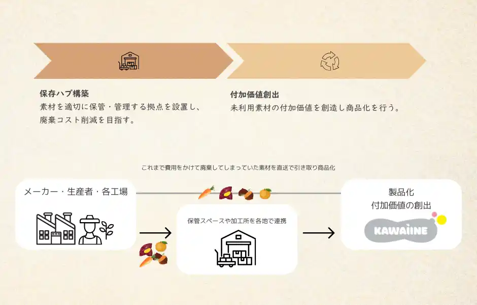 東京バルは、「JAアクラレーター」において、具体的に、未利用素材を適切に収集し、保管・管理する拠点を構築し、新商品として付加価値を創出し市場に出すまでの一連のプロセスの構築に携わっています。東京バルは、廃棄コストを削減するとともに、各地域における農産物の品質と多様性、魅力を積極的に発信し、地域ブランドとしての認知度の向上にも貢献しています。 |