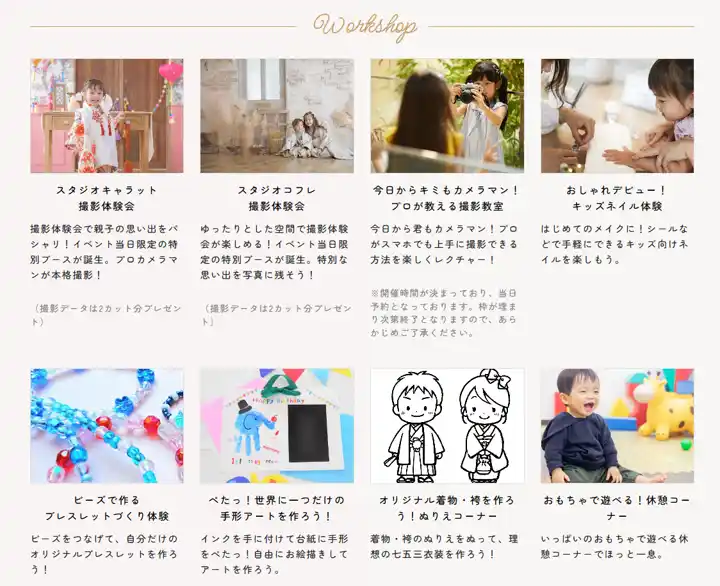 当日は、本イベント限定の特別ブースで撮影できる無料撮影体験会や、こどもでもオシャレ体験ができるキッズネイルやアクセサリーづくりのワークショップなど、親子で楽しめるコンテンツを多数ご用意しています。 |