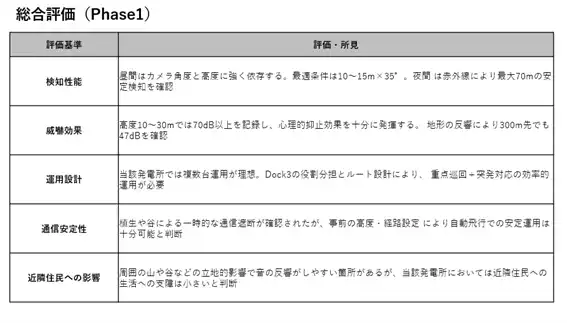 実証実験の結果、ドローンによる巡回・威嚇は盗難抑止に非常に有効であり、盗難行為を未然に防ぐ効果が高いことが確認されました。一方、巡回ルートや運用するドローンの台数は、施設の立地や設備配置により最適化する必要があり、また近隣住民への騒音・光の影響などについても個別施設ごとの対応が求められることが明らかになりました。 |