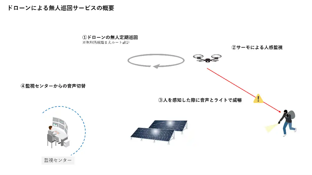 2025年7月に栃木県内の特高発電所(過去に複数回盗難被害があった施設)にて実施した実証実験では、DJI Dock 3および Matrice 4TDを用いて、日中および夜間の両時間帯において巡回方法、威嚇効果、近隣住民への影響などを詳細に検証しました。 |