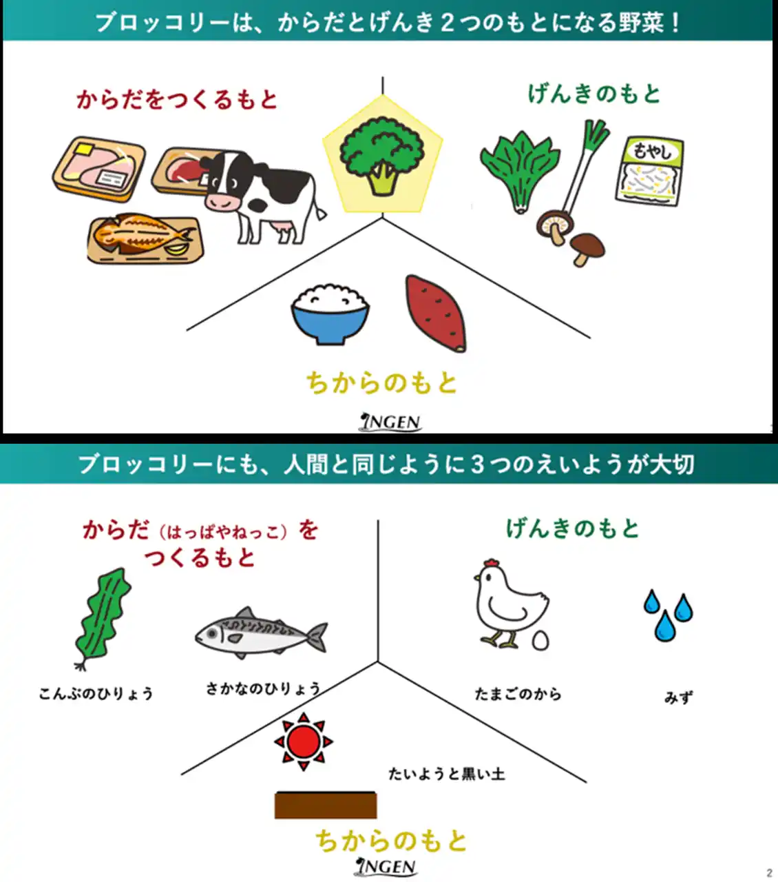 | 人間が健やかに成長するために欠かせない「からだをつくるもと」「げんきのもと」「ちからのもと」。ブロッコリーは、このうち「からだをつくるもと」と「げんきのもと」を豊富に含んでいます。勉強会では、人間・ブロッコリーの「体づくりに大切な栄養」をテーマに、ブロッコリーがどのように自分たちの体づくりに役立つのか、そしてブロッコリーを育てる上でも同様の栄養が大切であることを分かりやすくお伝えします。 | |||