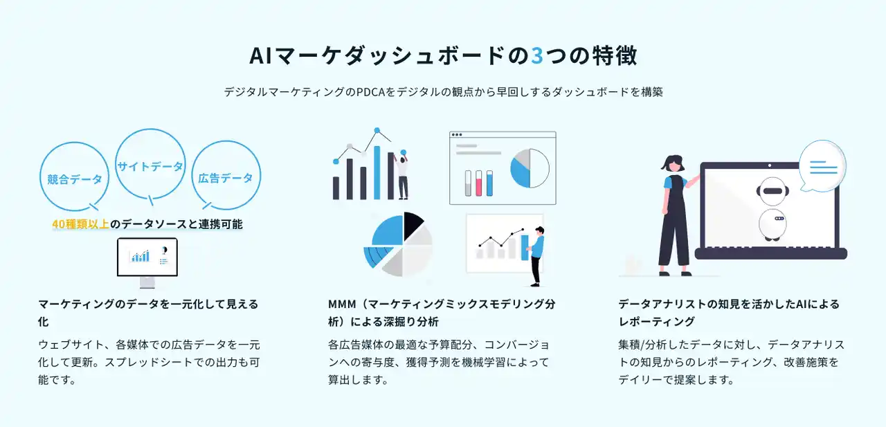 | 「AIマーケダッシュボード」は企業のマーケティング活動をデータドリブンに改善することを目的としたサービスです。広告データを自動で一元化しダッシュボード化することによって、レポーティングやデータ可視化の手間を削減するとともに、機械学習と生成AIにより現状把握と改善に向けた打ち手をデイリーで提案します。効果が見えづらい、TVCMやOOH、その他キャンペーンなどのオフライン施策についてもカスタマイズされた分析により、費用対効果を明確にすることが可能です。 | |||