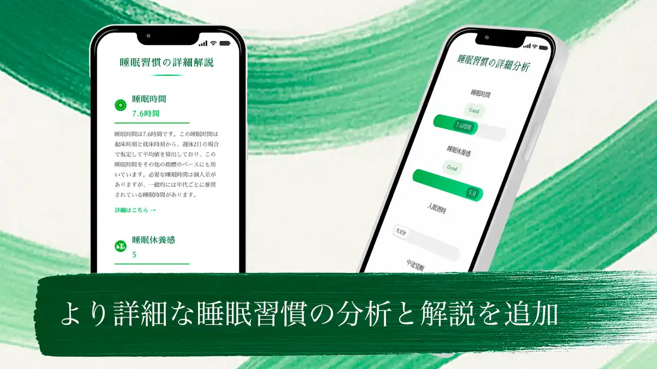 評価とアドバイス機能をリニューアルしました。日中の眠気評価と睡眠習慣データをより精緻に結び付け、個々の傾向に沿った行動提案を生成します。 |