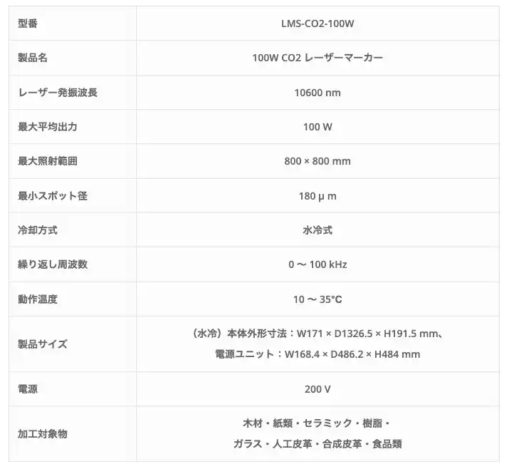 レーザー出力を100 Wまで高めることで、従来製品である30 W CO2レーザーマーカー(LMS-CO2-30A)との比較で3倍のスピードでの印字・刻印を実現するとともに、より多様な加工用途に対応可能となりました。 |