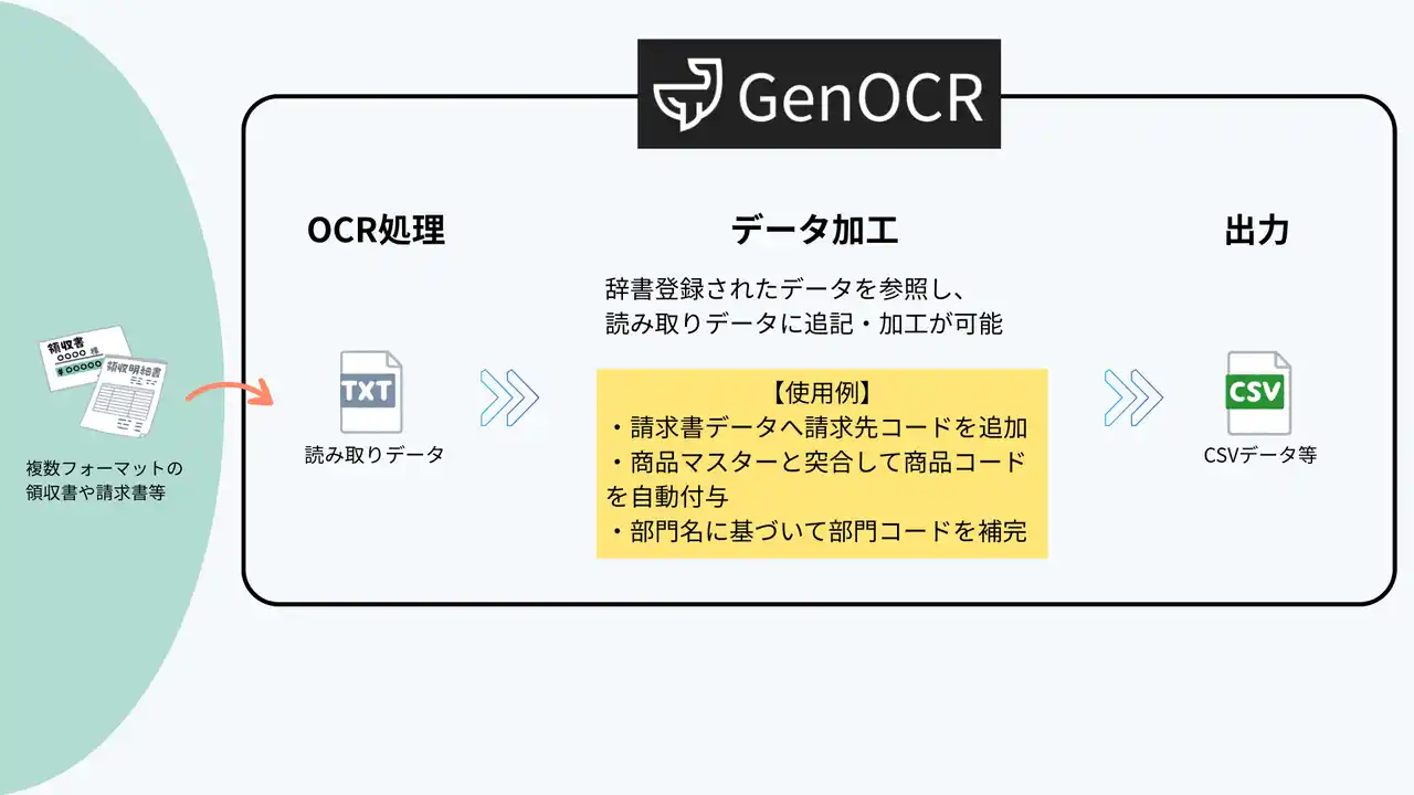 | ジンベイ株式会社(本社:神奈川県横浜市、代表取締役:上田英介)は、生成AI-OCR「ジンベイGenOCR」において、新たに「加工対象カラムを指定できるデータ加工機能」を追加しました。これにより、OCRで読み取った項目に対して、カラム単位での辞書置換やコード付与などのデータ変換が可能になり、後続システムでの処理効率をさらに高めることができます。 | ||||
