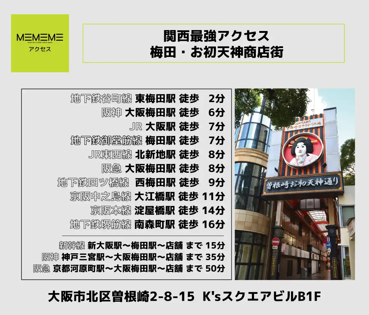 地下鉄御堂筋「梅田駅」徒歩8分 |