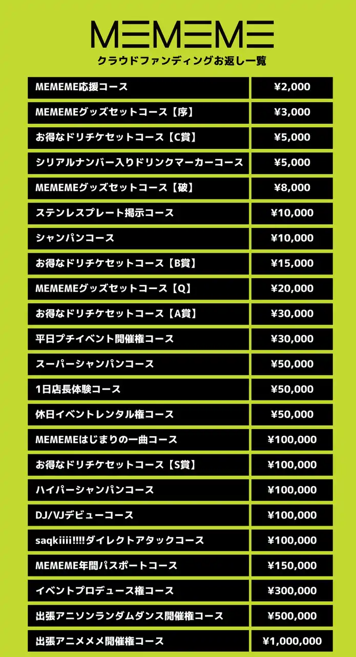株式会社アブストリームクリエイション(代表取締役社長:松岡洋介/本社:東京都千代田区)大阪支社(支社長:崎村佑貴)は、アニソンエンターテインメントプロジェクト「アニメメメ」を主催するsaqkiiii!!!!プロデュースのもと、新店舗「MEMEME(メメメ)」の開業に向けたクラウドファンディングを、クラウドファンディングプラットフォーム「うぶごえ」にて支援受付を開始したことをお知らせいたします。 |