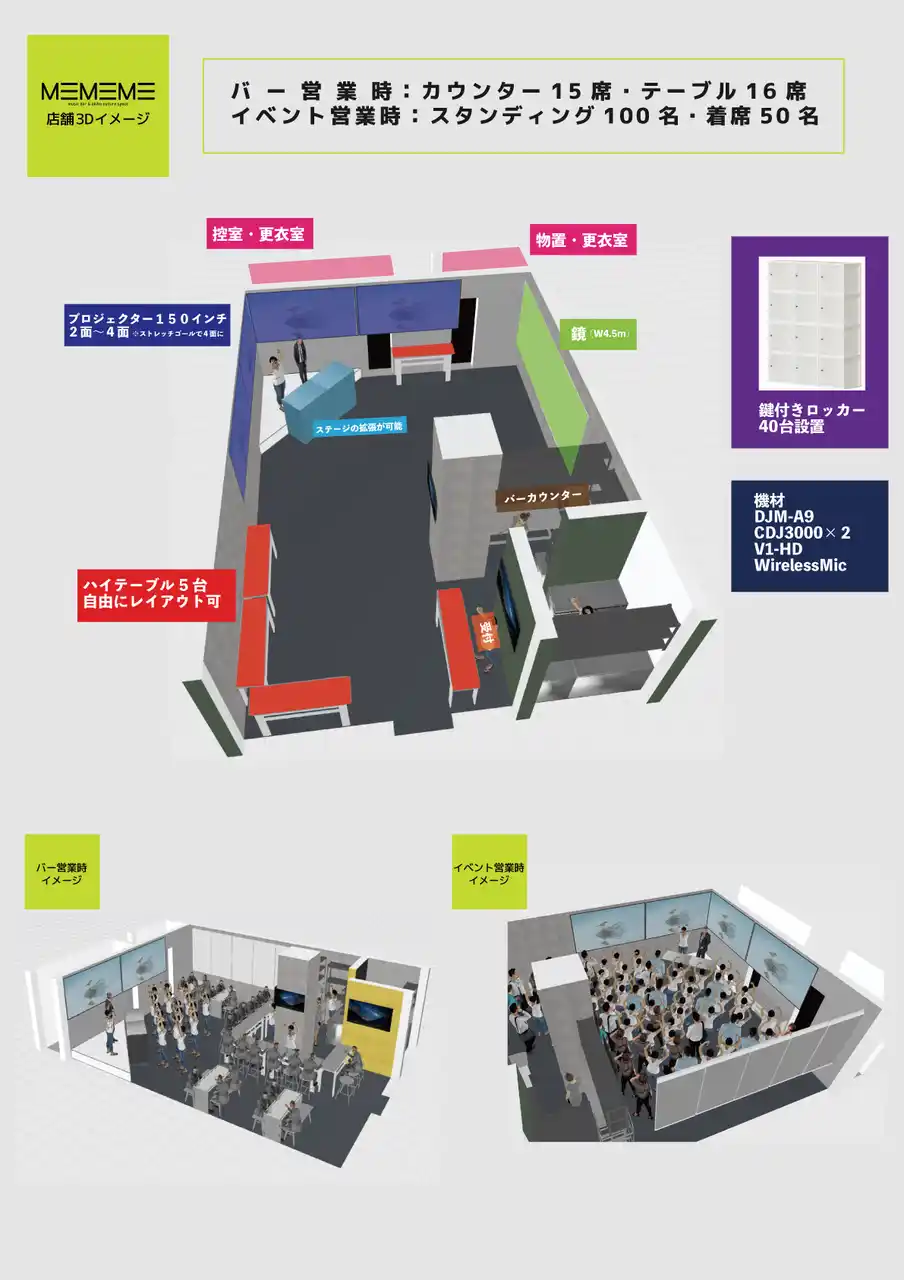 MEMEME は、アニソンやボーカロイド、Vtuber、コスプレなどの“アキバカルチャー”に加え、J-POP、ロック、クラブミュージックなど多様なカルチャーを受け入れる、開かれた発信拠点をコンセプトにしたミュージックバー/レンタルスペースです。 |