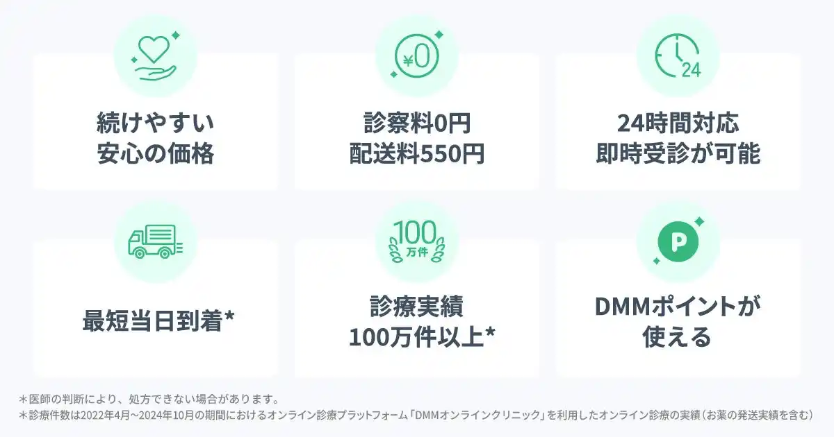 ※1 診療件数は2022年4月~2024年10月の期間におけるオンライン診療プラットフォーム「DMMオンラインクリニック」を利用したオンライン診療の実績(薬の発送実績を含む)です。 |