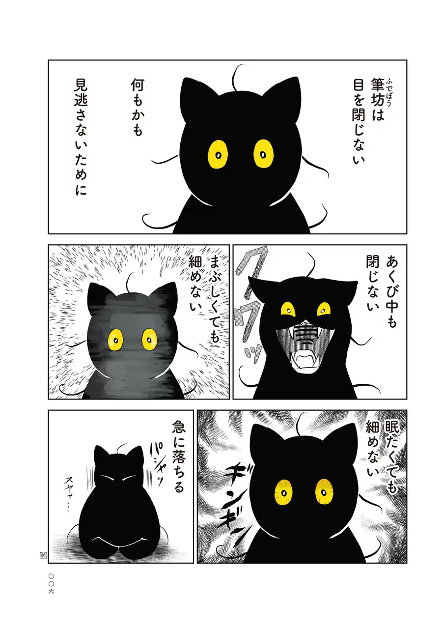 筆坊は飼い主に媚びることなどしない誇り高き矜持を携えた黒猫である。今日も強い目力で飼い主を威嚇し、噛みつくことで自らの誇りを見せつけるのだ。そんな筆坊と飼い主の緊張感あふれる毎日をこの度目出度く書籍化。 |